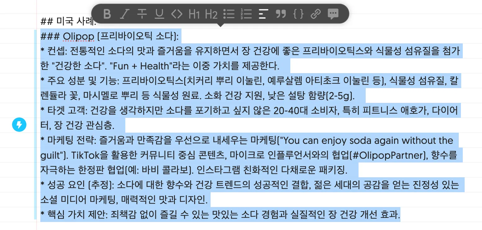 내용을 드래그하면 좌측에 번개모양이 나타나요.