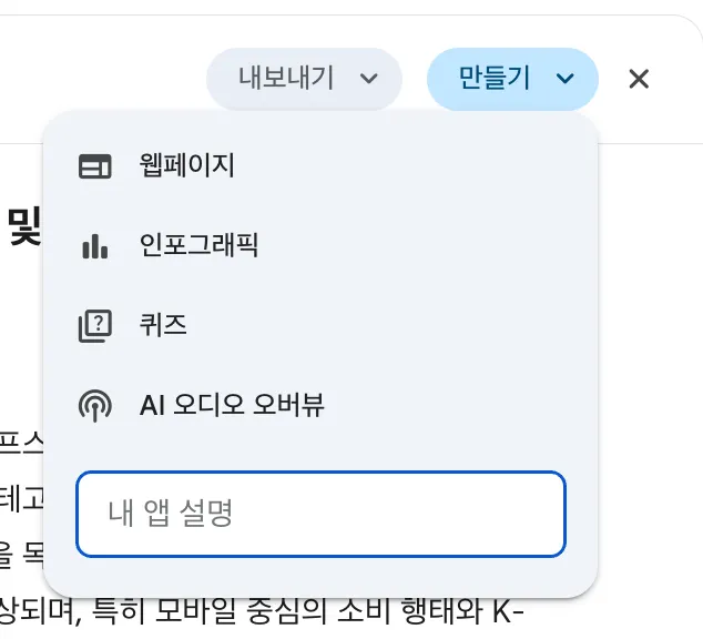 심층연구가 완료되면 결과를 확인하고, 우측 상단 만들기를 클릭하여 빠르게 시각화 해보세요.