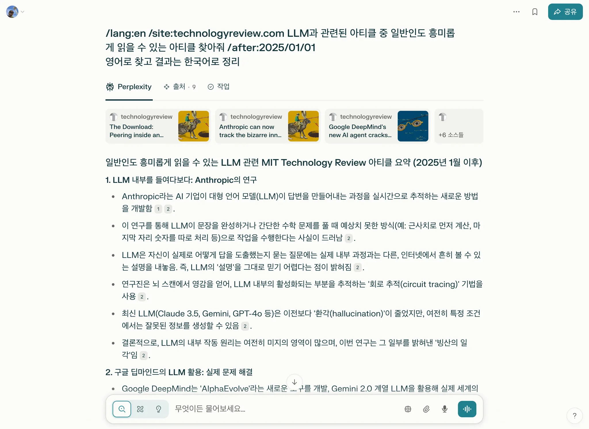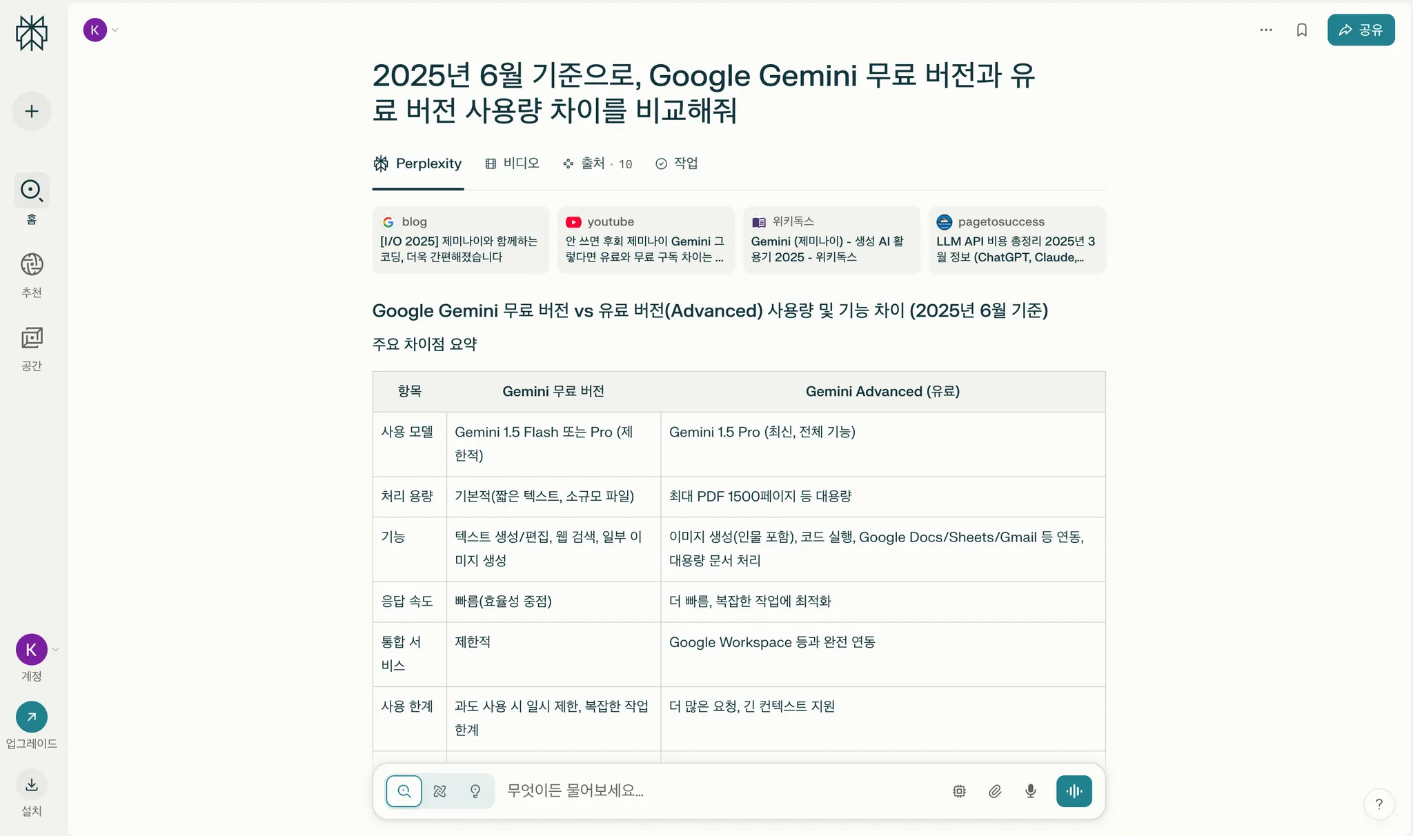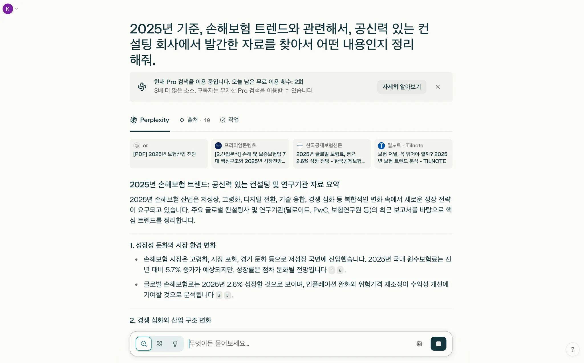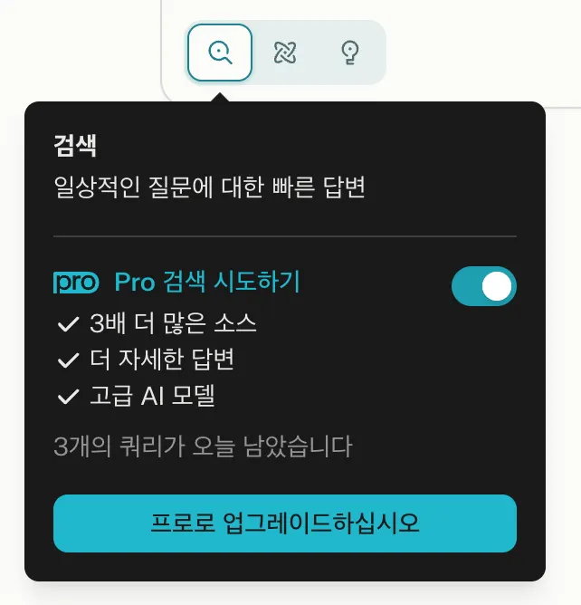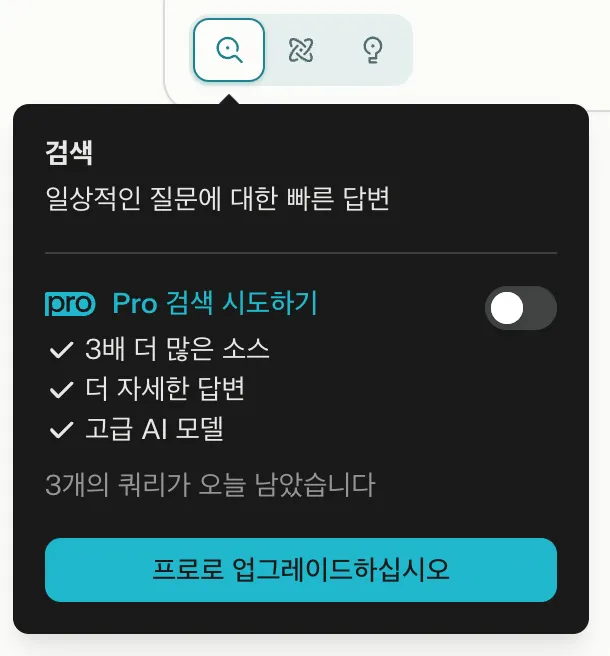 무료 플랜은 하루에 3번까지 Pro 검색이 가능해요. Pro 검색에서는 AI를 고를 수도 있고, 참고하는 문서도 훨씬 많아져요.