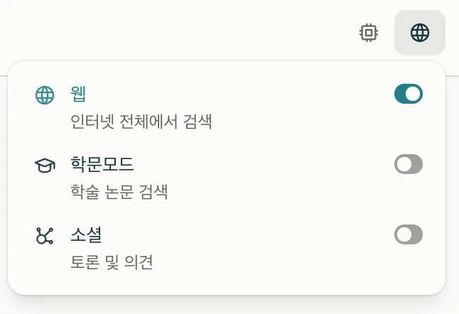지구본 아이콘을 클릭해서 웹/학문/소셜 중 필요한 옵션을 선택해주세요.