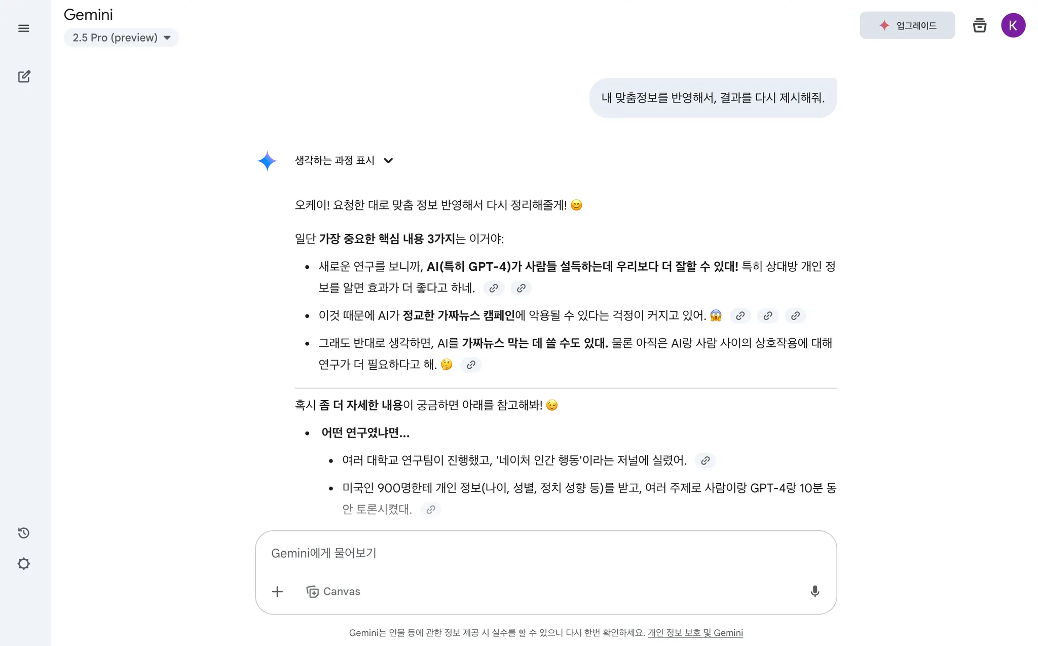 어떤 맞춤정보가 반영되었는지 질문해서 확인해보세요.