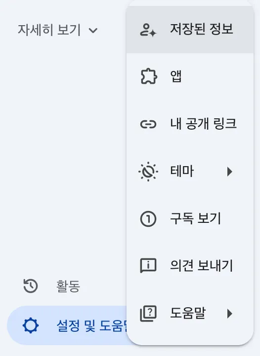 좌측 하단의 설정 및 도움말 → 저장된 정보 메뉴를 선택해주세요.