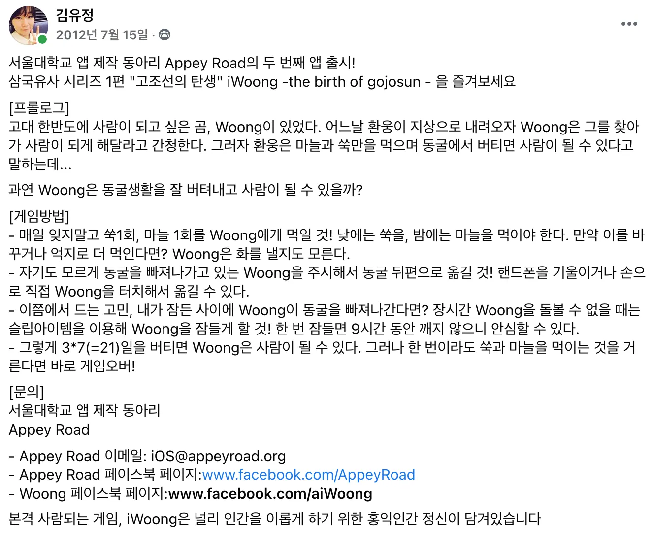 돌이켜보면 동아리에서 기획도 하고 디자인도 하고 코딩도 배우고 배우자도 만나고(응?) 했으니 인생 후반부를 많이 결정 지은 중대한 경험이긴 하네요. 이런저런 토이 앱들을 만들면서 신나게 동아리 활동을 했고요. 그러다가 게임 기획과 코딩도 해보고 아기자기하게 지내면서 뭔가 이 길로 본격적으로 접어들게 되었습니다.