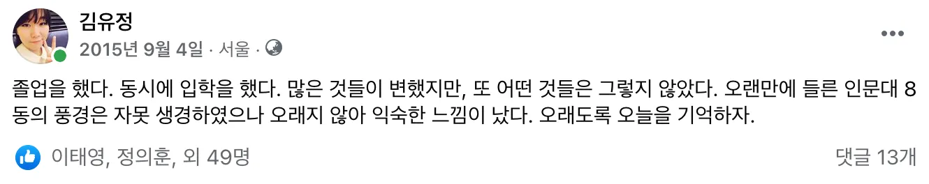 저는 국사학과 언론정보학을 복수전공하던 평범한 학부생이었습니다. 과제도 열심히 하고 그 시절 신기술(?)이던 페북도 열심히 하고요. 나름 모범생이라 수업은 열심히 듣고 과제도 성실히 했지만 딱 거기까지? 내 인생에 대학원이라는 키워드가 들어오리라고는 상상도 못했습니다.