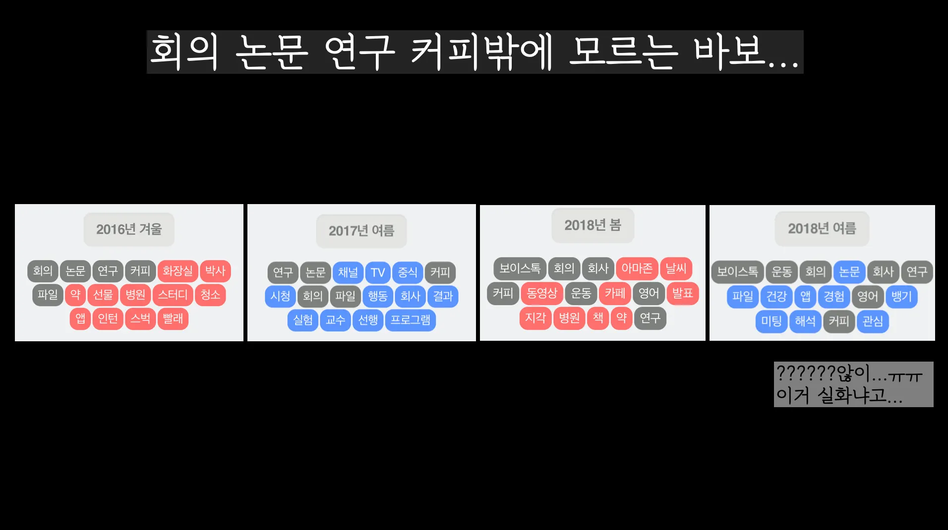 연인과의 카카오톡 대화를 분석했는데 왜 키워드가 연구 논문 이런 것밖에 없었던걸까? 그리고 여기서 '중식'은 점심식사가 아닌 우리 지도교수 이름이라는 점을 밝힌다.